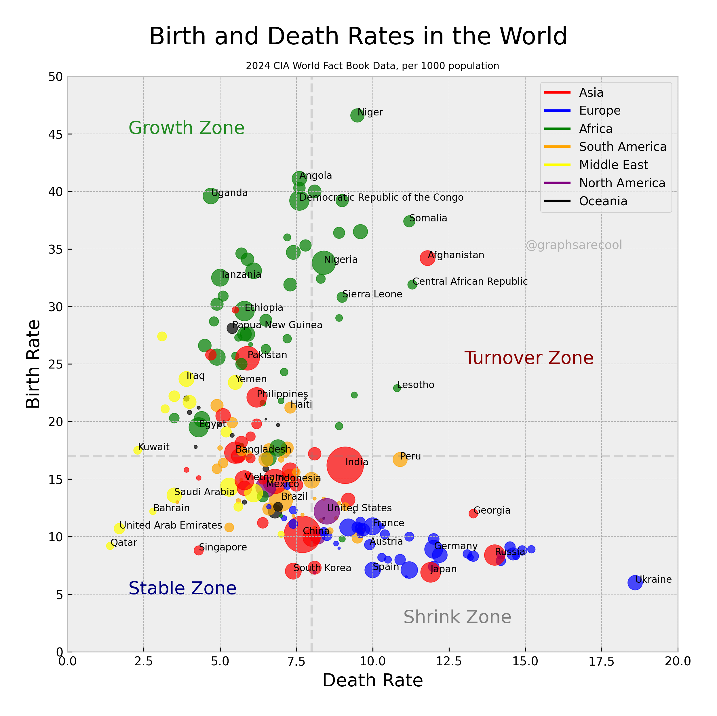 Bubble chart of countries' birth and death rates by population size and continent.
