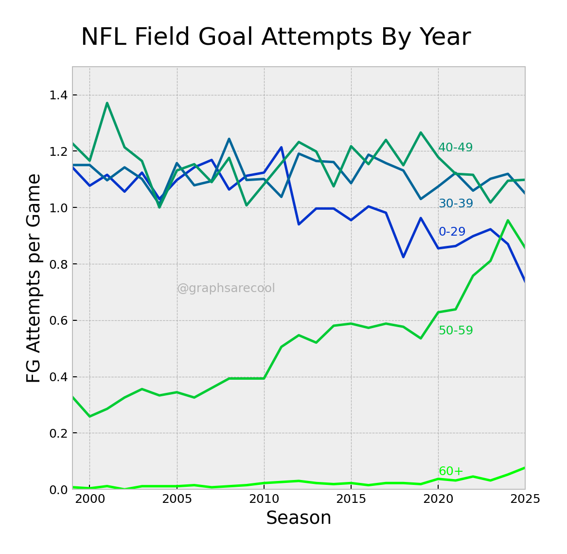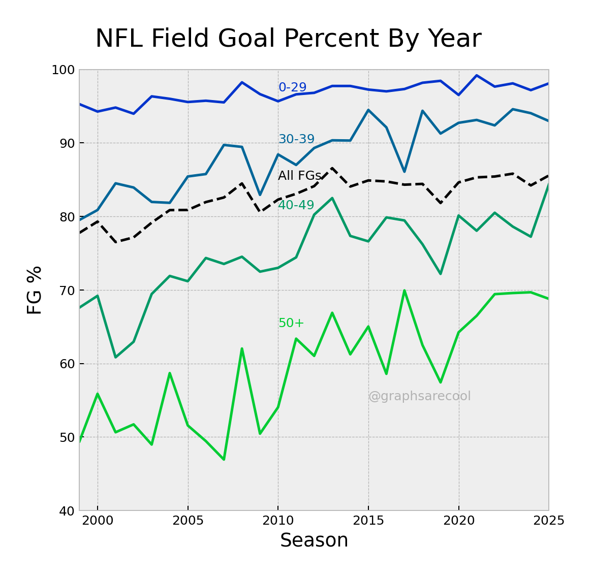 Graphs of NFL field goal data over time, distance, and other factors.