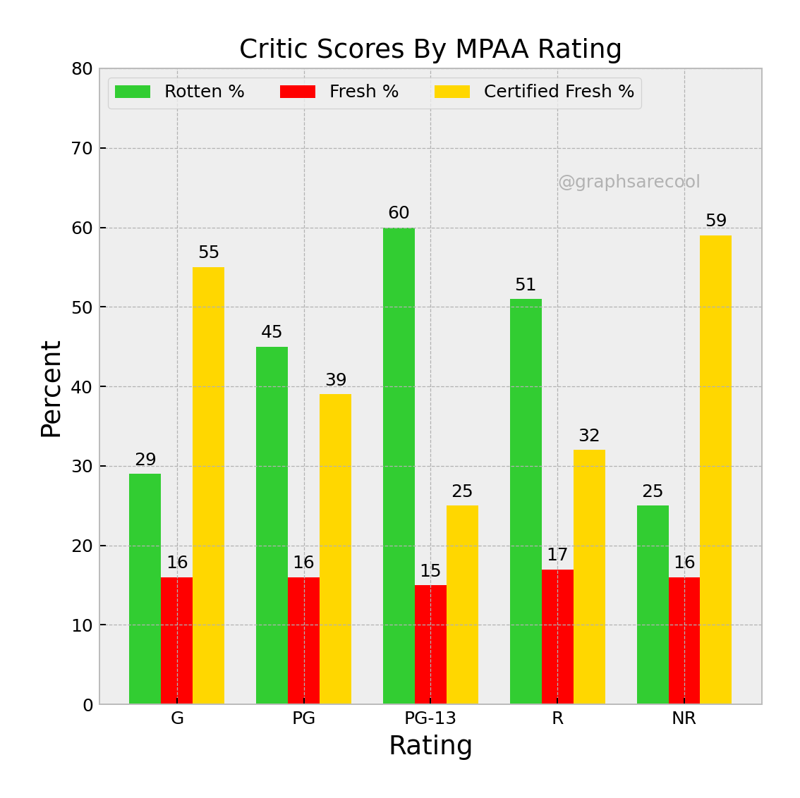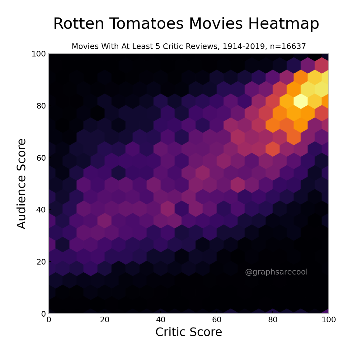 Heatmap, scatterplot, bar chart, and graphs of Rotten Tomates movie scores.