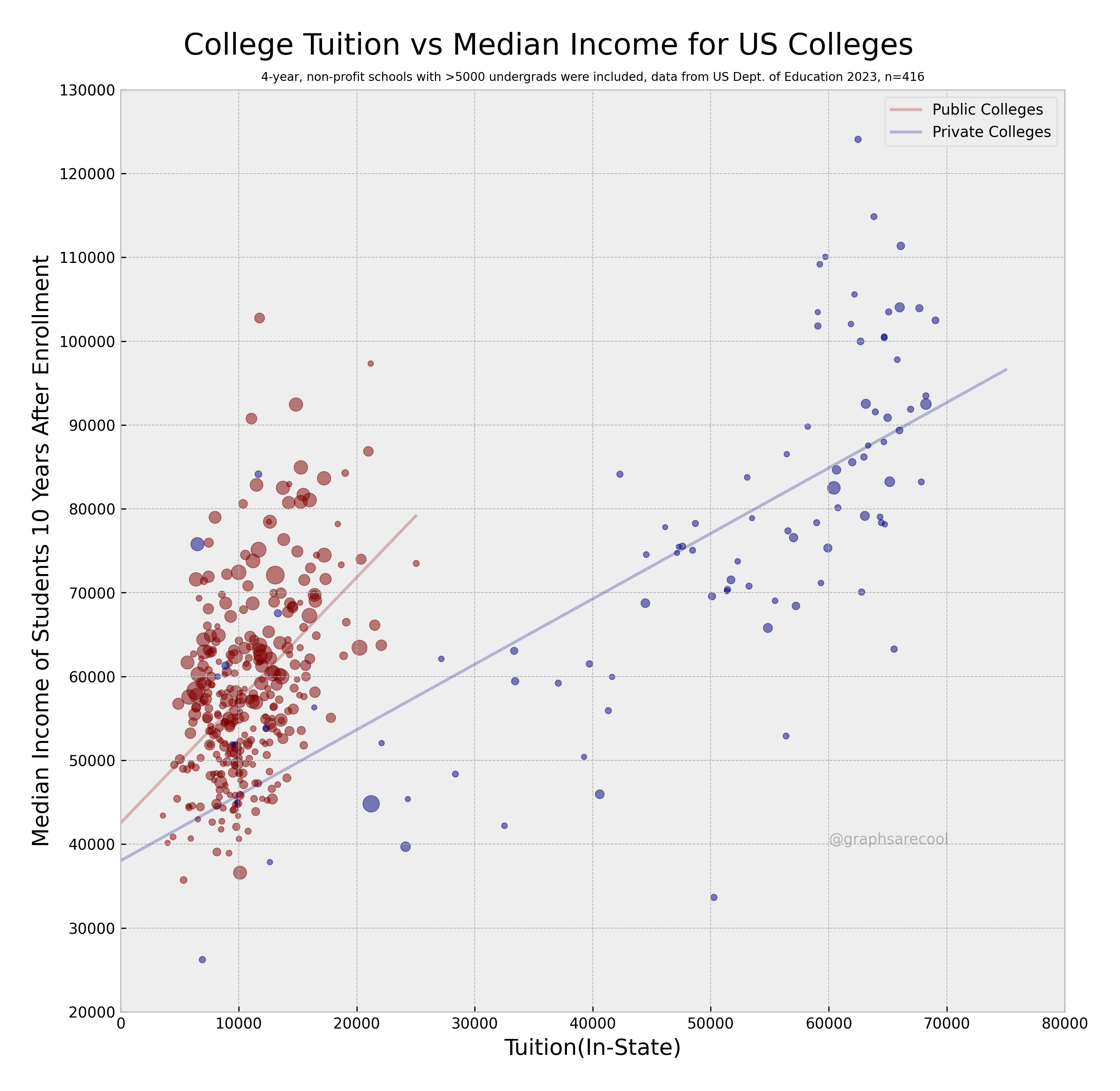 Scatter plot and trendlines of US colleges by tuition and student incomes.