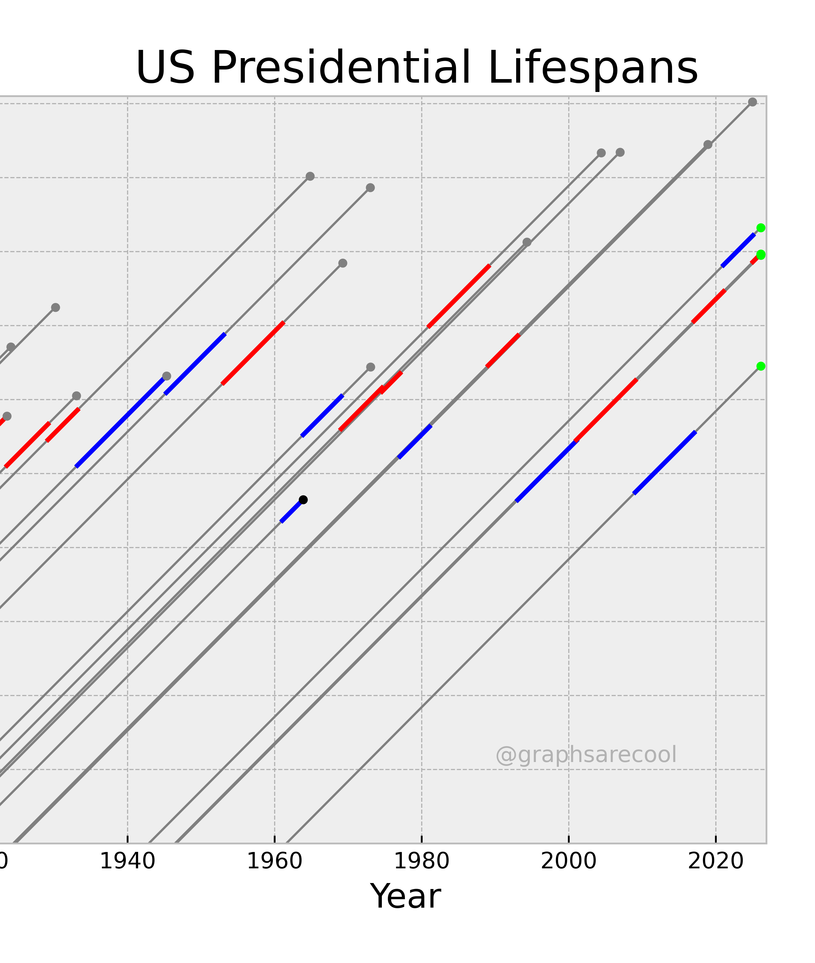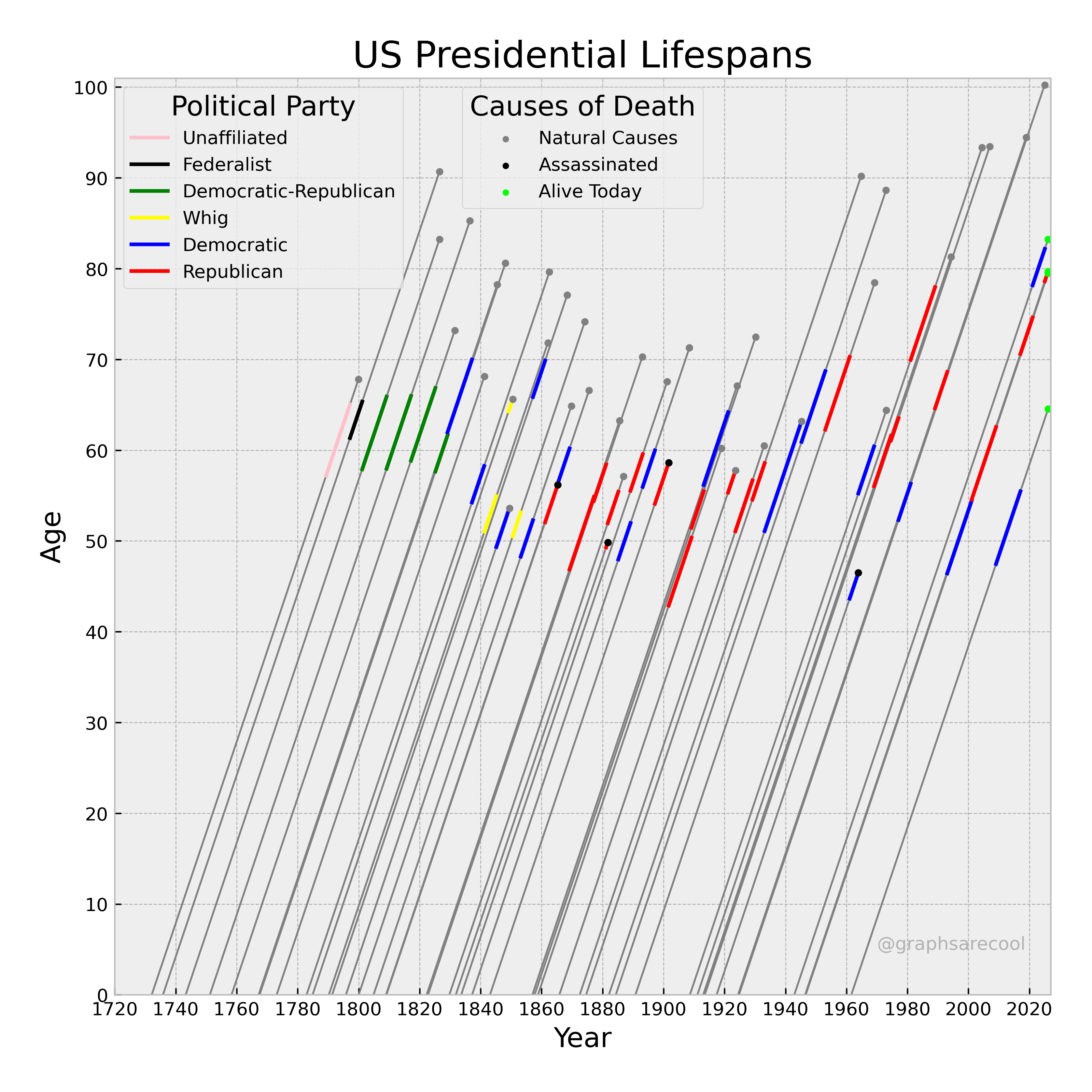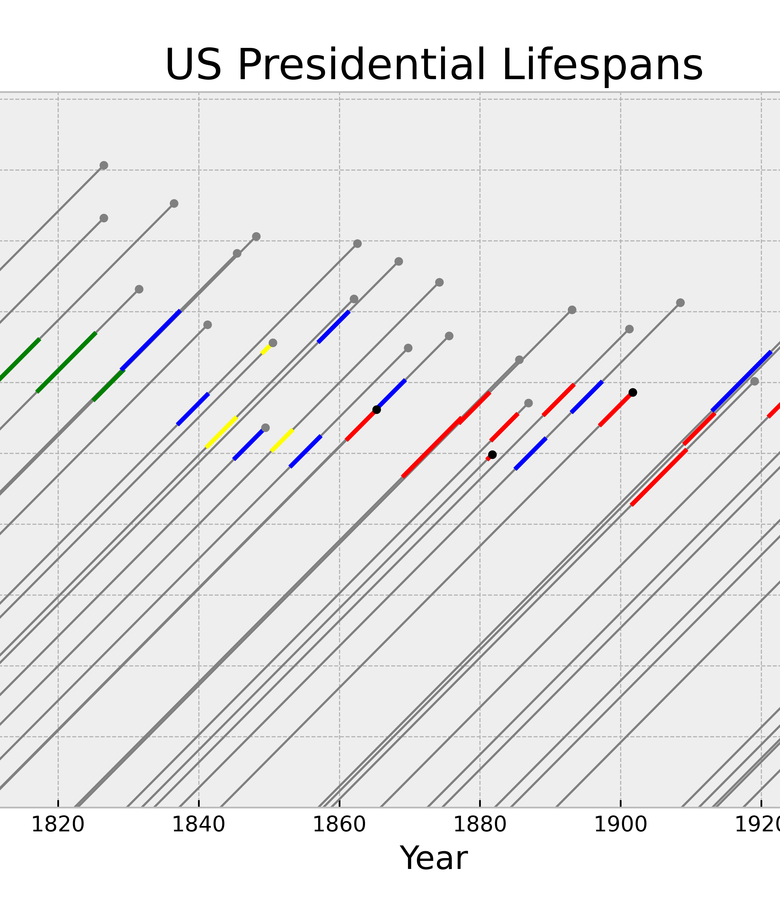 Lexis diagram of all US presidents' lives and tenure.