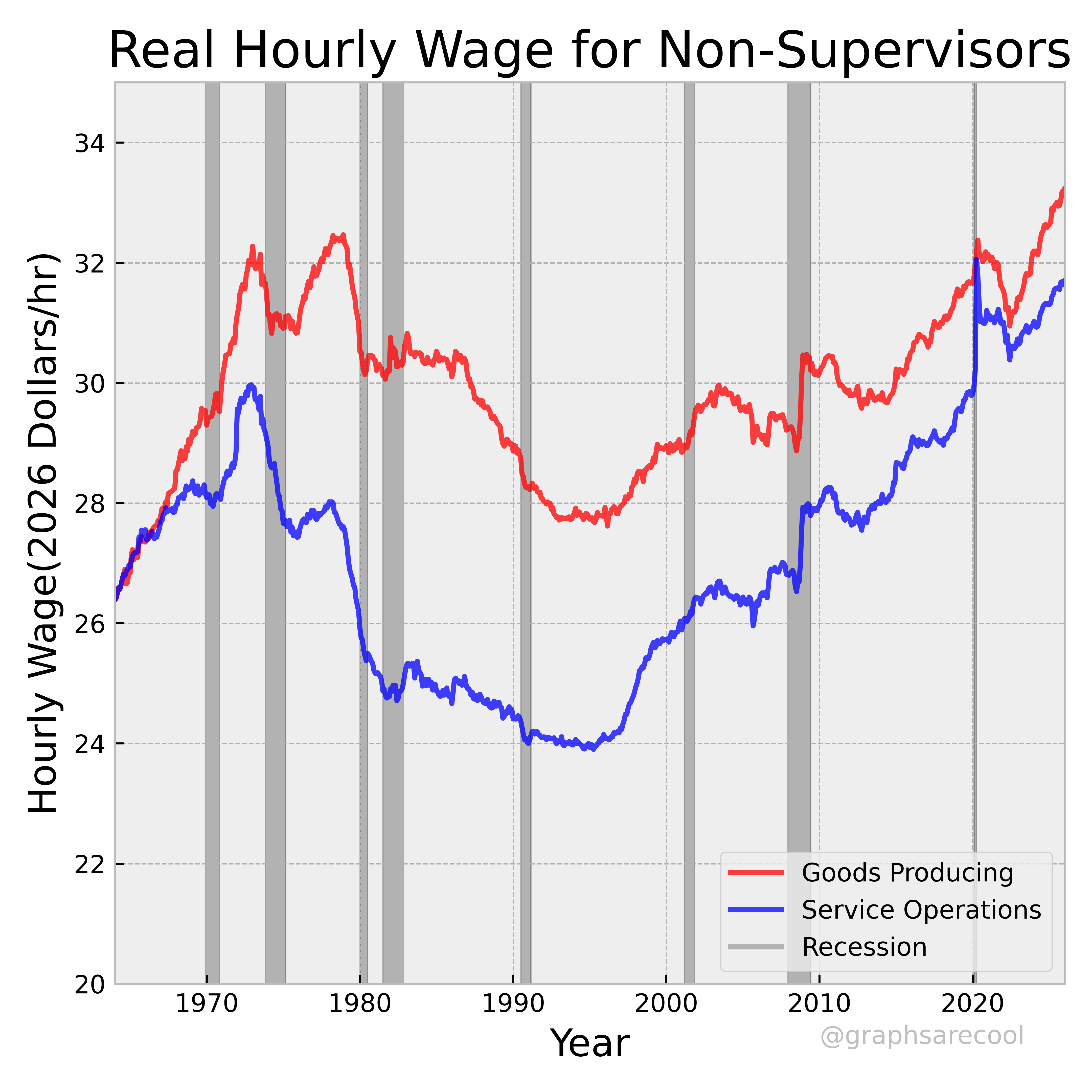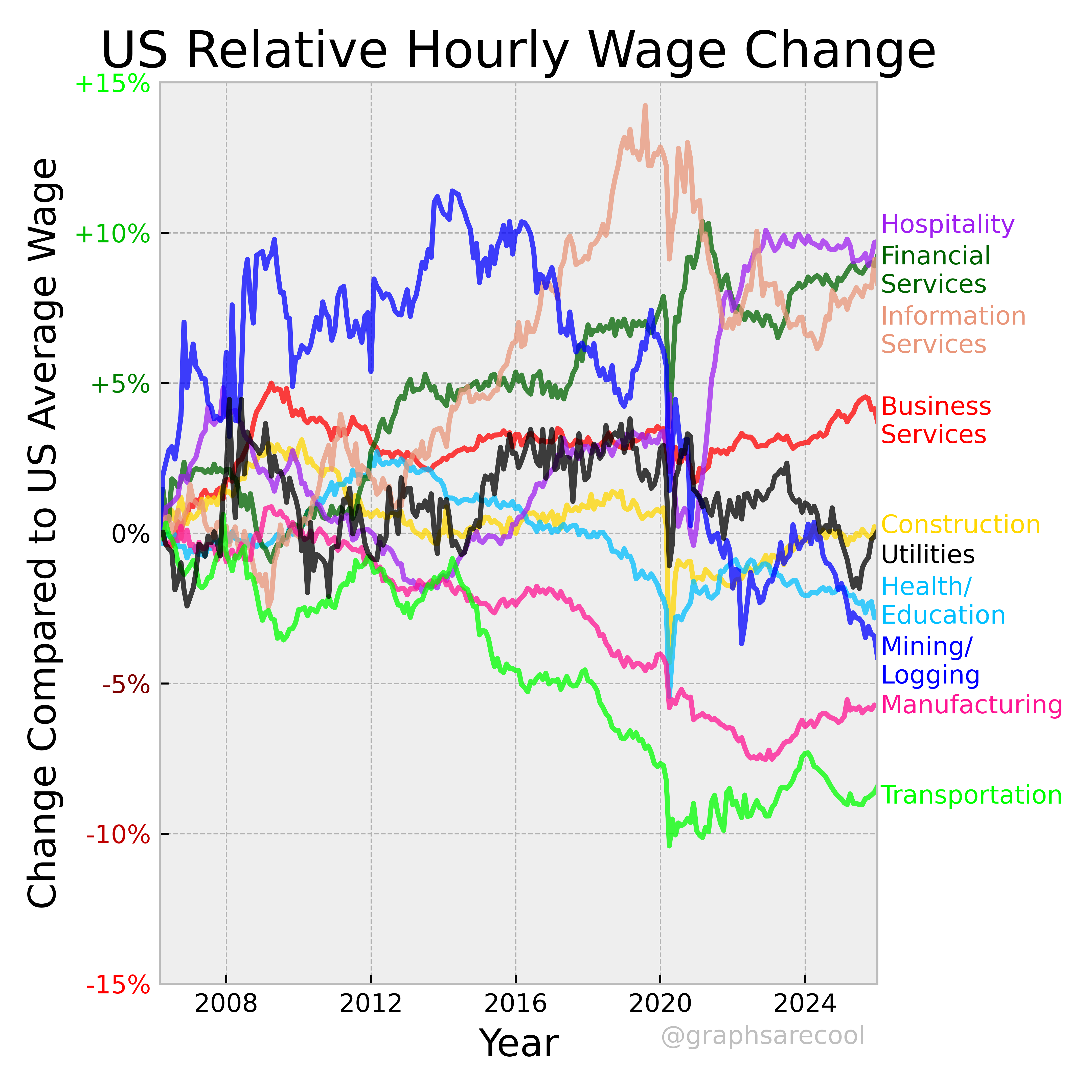 US relative wage growth in 10 sectors, and real wages in goods and service sectors.